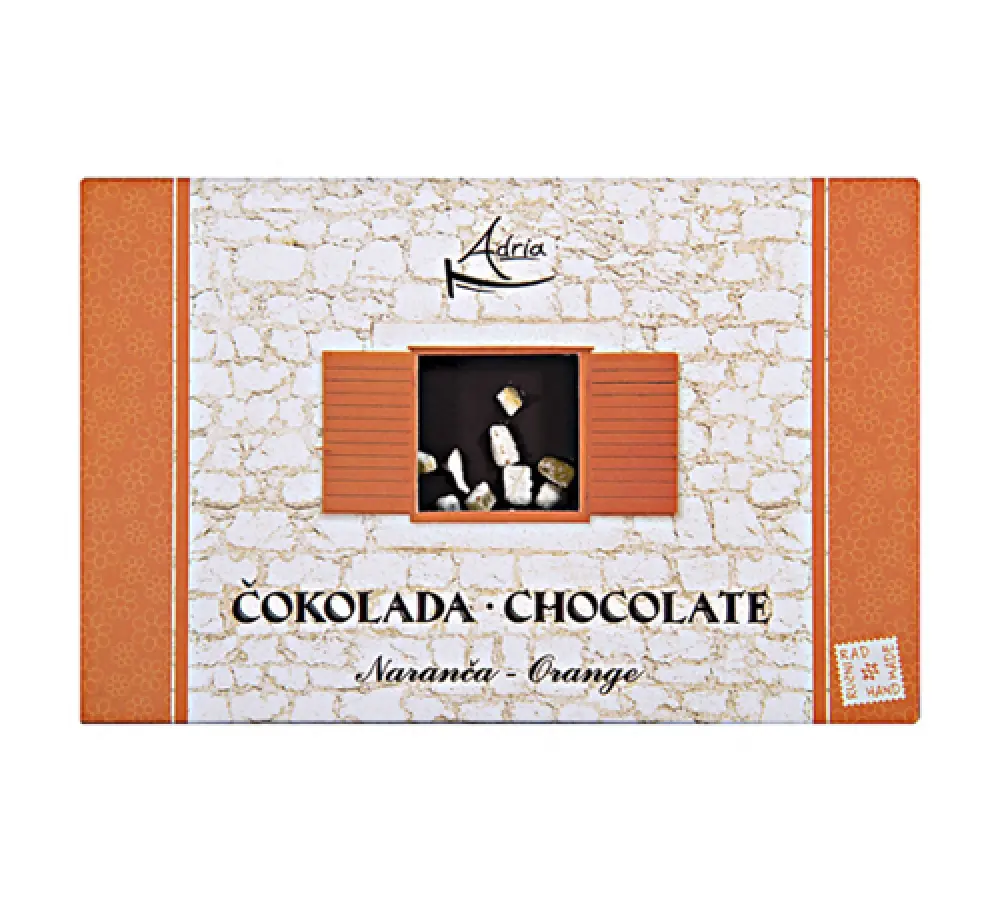 kakao masa, šećer, kakao maslac, ušećerene kora naranče 4 % (kora naranče, šećer, voda), emulgator: sojin lecitin, prirodna aroma vanilijeProizvod sadrži soju, a može sadržavati mlijeko i lješnjak u tragovima