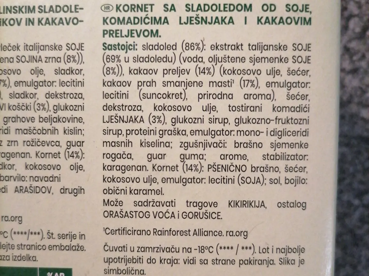 Soy ice cream, hazelnut pieces and cocoa topping.