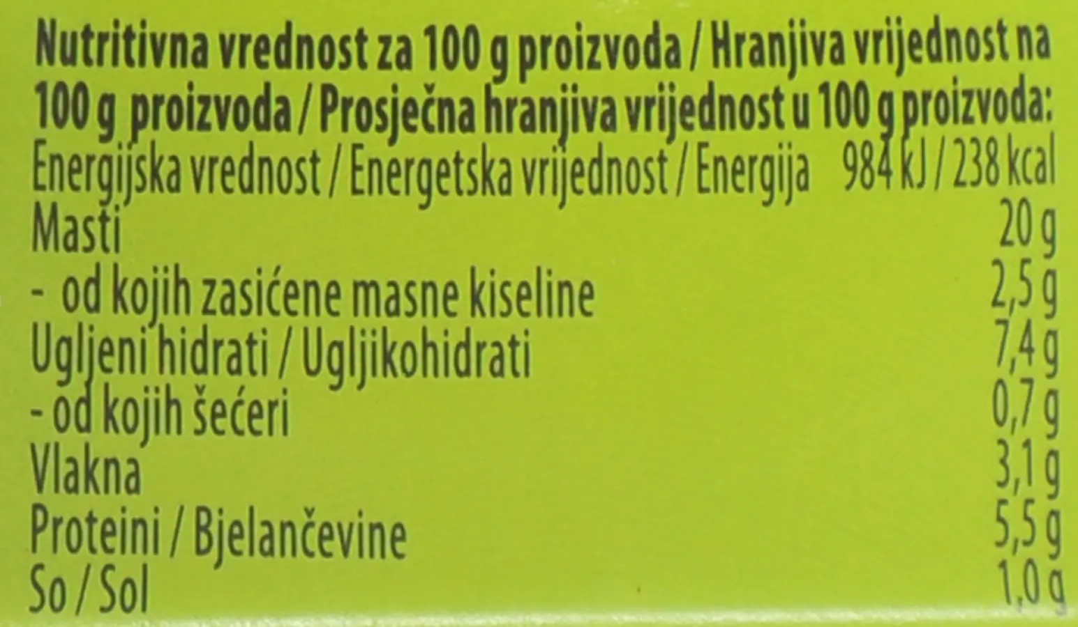Kuhani slanutak 33 %, voda, pasta od crnih maslina 26 % (crne masline, maslinovo ulje, vinski ocat, origano, sol), biljno ulje (suncokretovo, repičino i sojino u promjenjivim udjelima), tahini (pasta od sezama), sjeme sezama, koncentrat limunovog soka, šećer, sol, češnjak, bijeli papar.