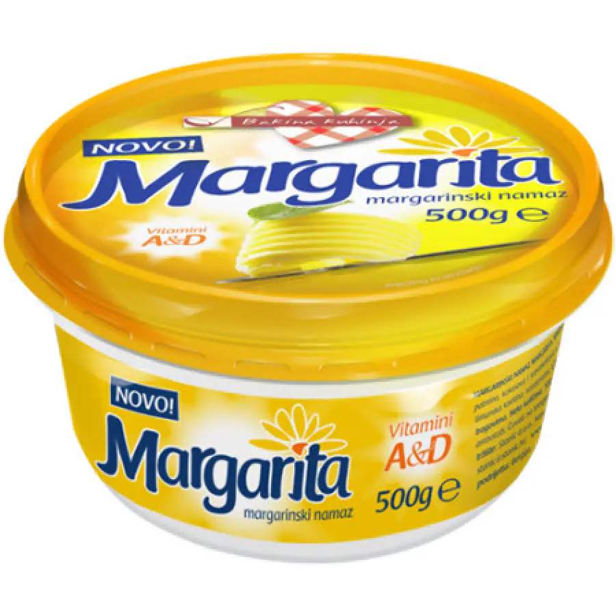voda, biljna ulja, biljna mast, emulgatori: mono- i digliceridi masnih kiselina i poliglicerol poliricinoleat, kuhinjska sol (0,5 %), kiselina: limunska kiselina, konzervans: kalijev sorbat, bojilo: beta-karoten, aroma, vitamini (A, D)