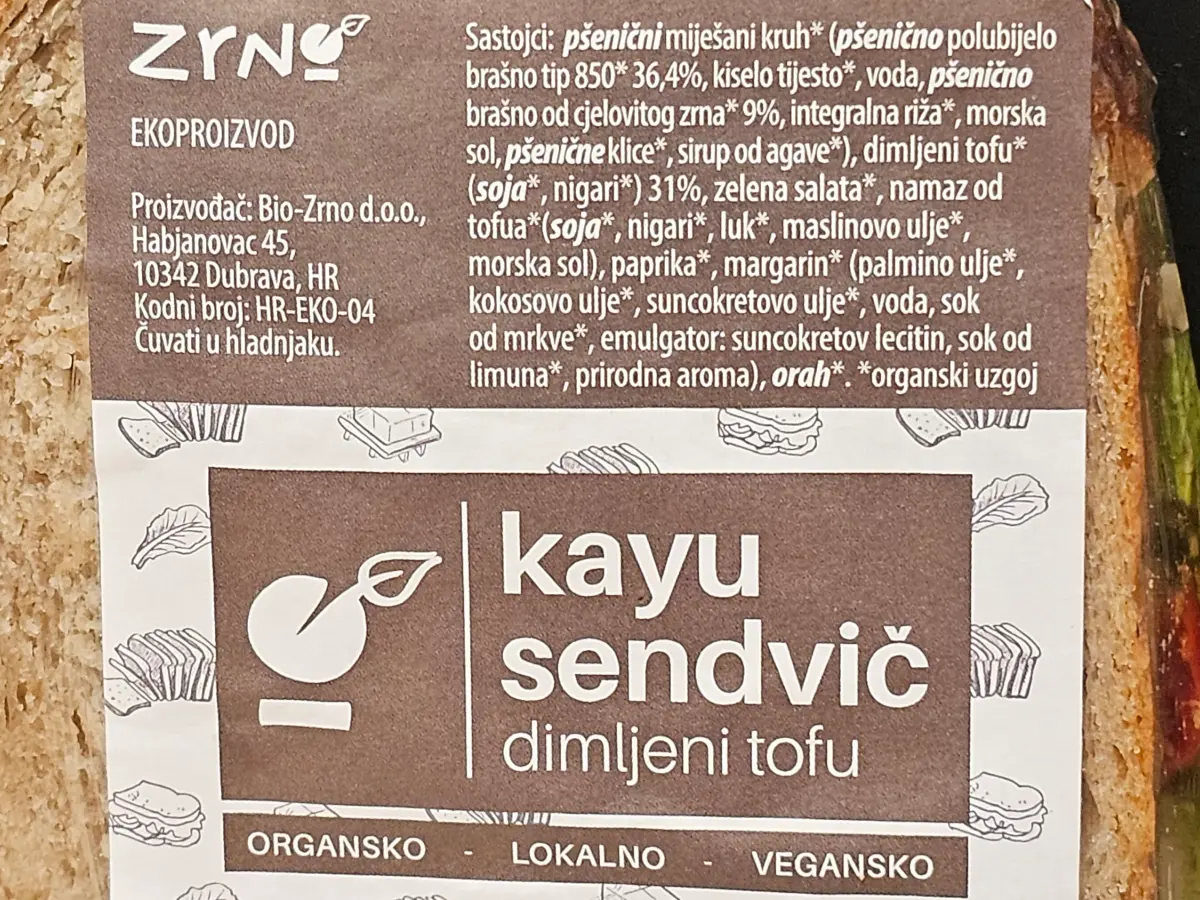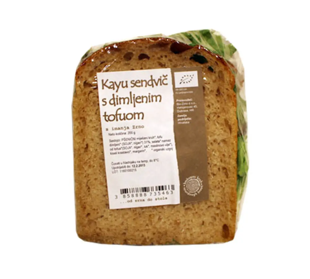 Pšenični miješani kruh, dimljeni tofu 31 % (soja, nigari), salata, namaz od tofua (soja, nigar, luk, maslinovo ulje), kiseli krastavci, margarin.