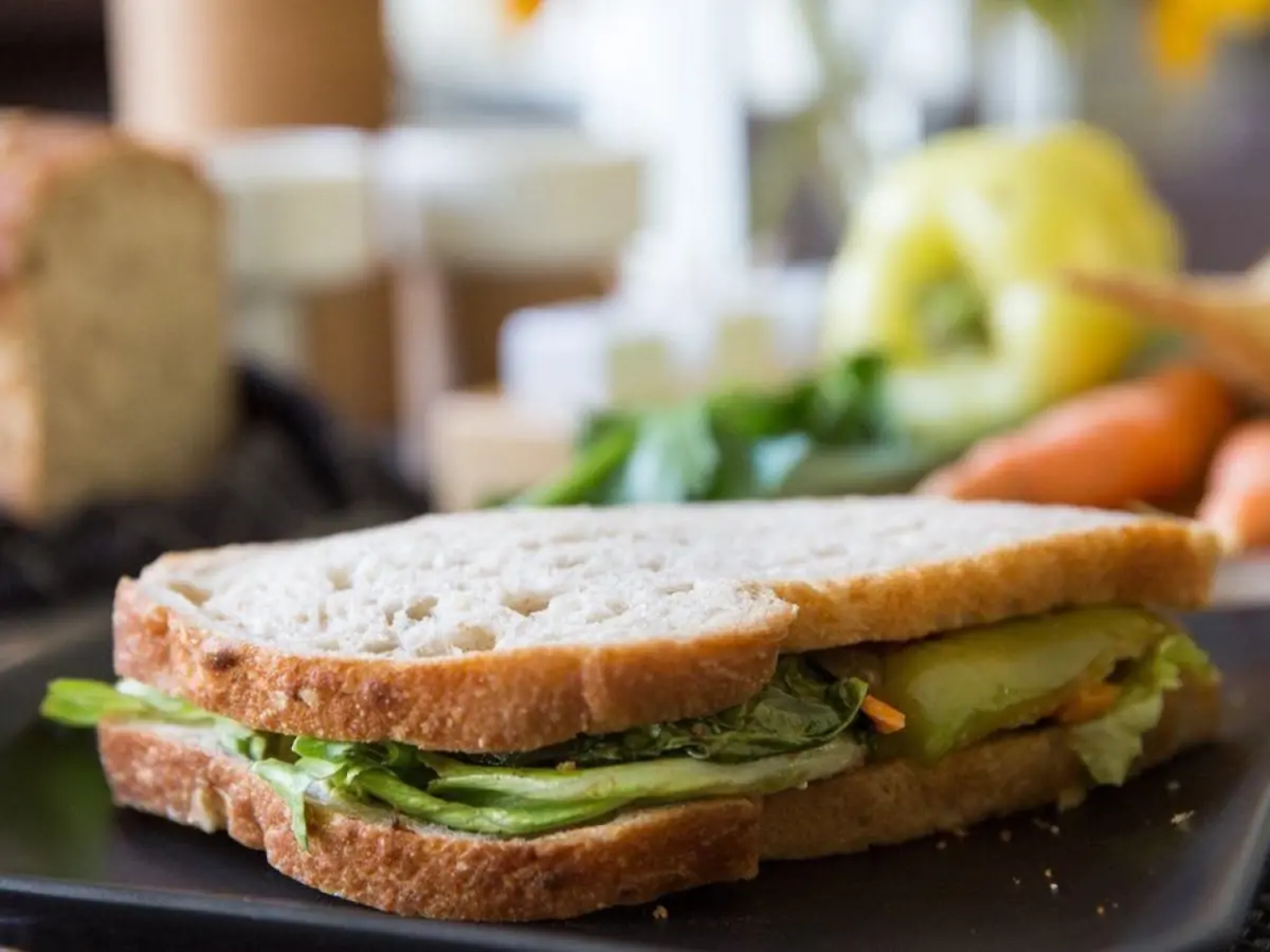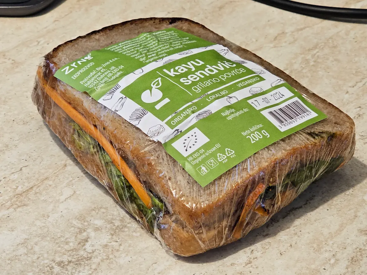 Pšenični miješani kruh* (pšenično polubijelo brašno tip 850* 36,4 %, kiselo tijesto*, voda, pšenično brašno od cjelovitog zrna* 9 %, integralna riža*, morska sol, pšenične klice*, sirup od agave*), paprika*, rajčica*, blitva*, tikvice*, zelena salata*, namaz od tofua* (soja*, nigari*, luk*, maslinovo ulje *, morska sol), mrkva*, namaz od rikule* (rikula*, maslinovo ulje*, orah*, morska sol, začini*).