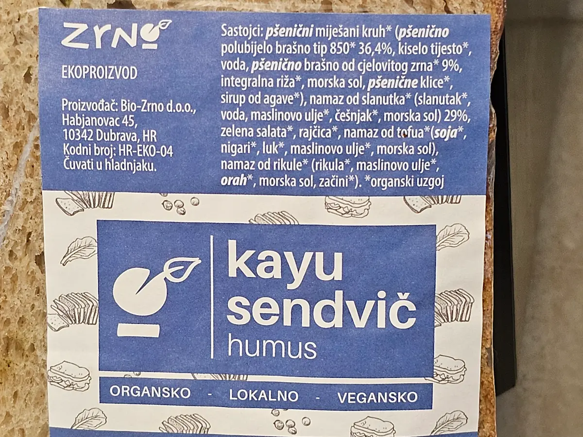 Pšenični miješani kruh, humus 29 % (slanutak, maslinovo ulje, češnjak, morska sol), salata, rajčica, namaz od tofua (soja, nigari, luk, maslinovo ulje), pesto od svježe rikule (rikula, maslinovo ulje, orah, češnjak, papar, morska sol).