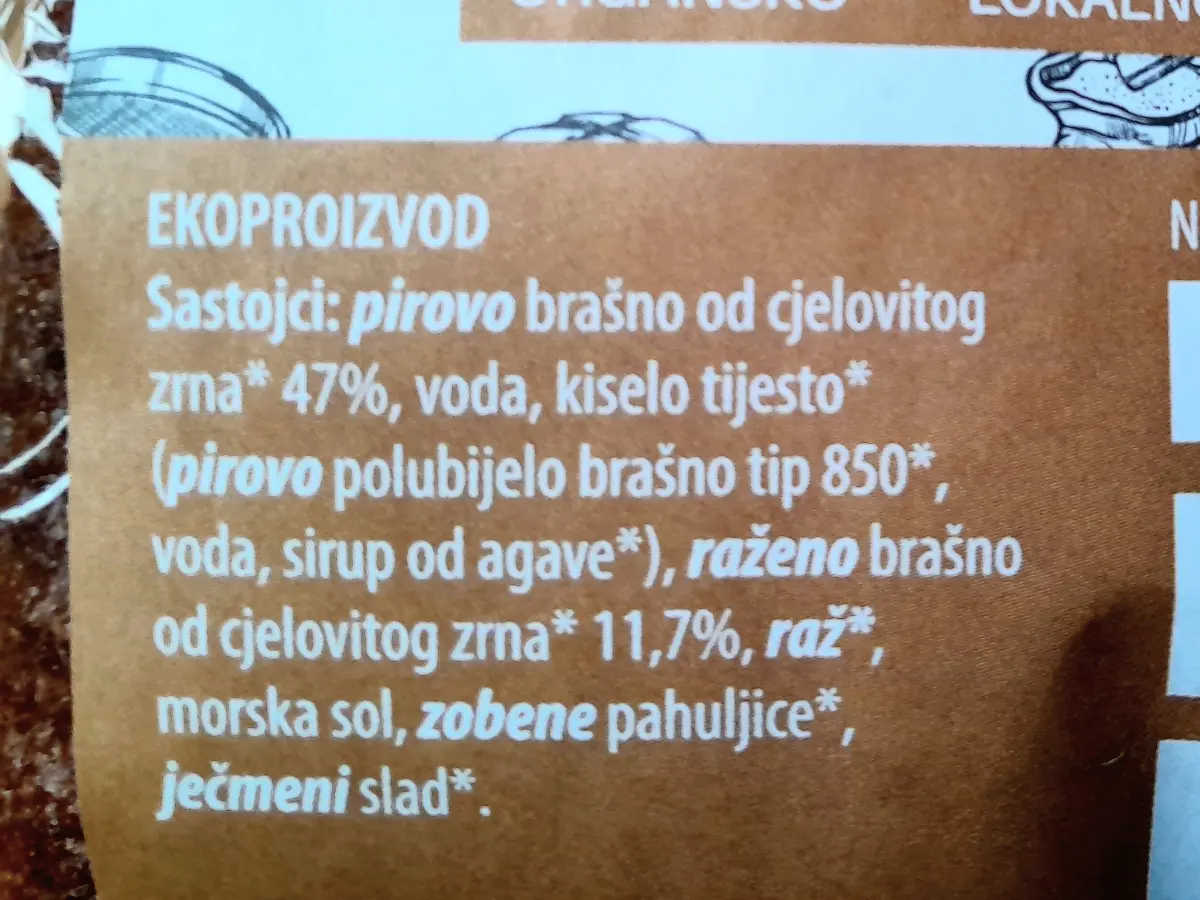 Pirovo brašno*, kiselo tijesto*, raženo integralno brašno*, raž*, morska sol, zobene pahuljice*, ječmeni slad*, suncokretovo ulje*. *ekološki uzgoj.