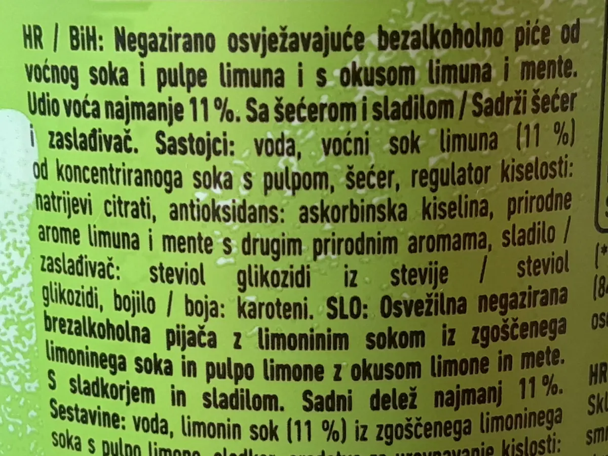 Voda, voćni sok limuna od koncentriranog soka s pulpom (11 %), šećer, regulator kiselosti: natrijevi citrati, antioksidans: askorbinska kiselina, prirodne arome limuna i mente s drugim prirodnim aromama, sladilo: steviol glikozidi, bojilo: karoteni.