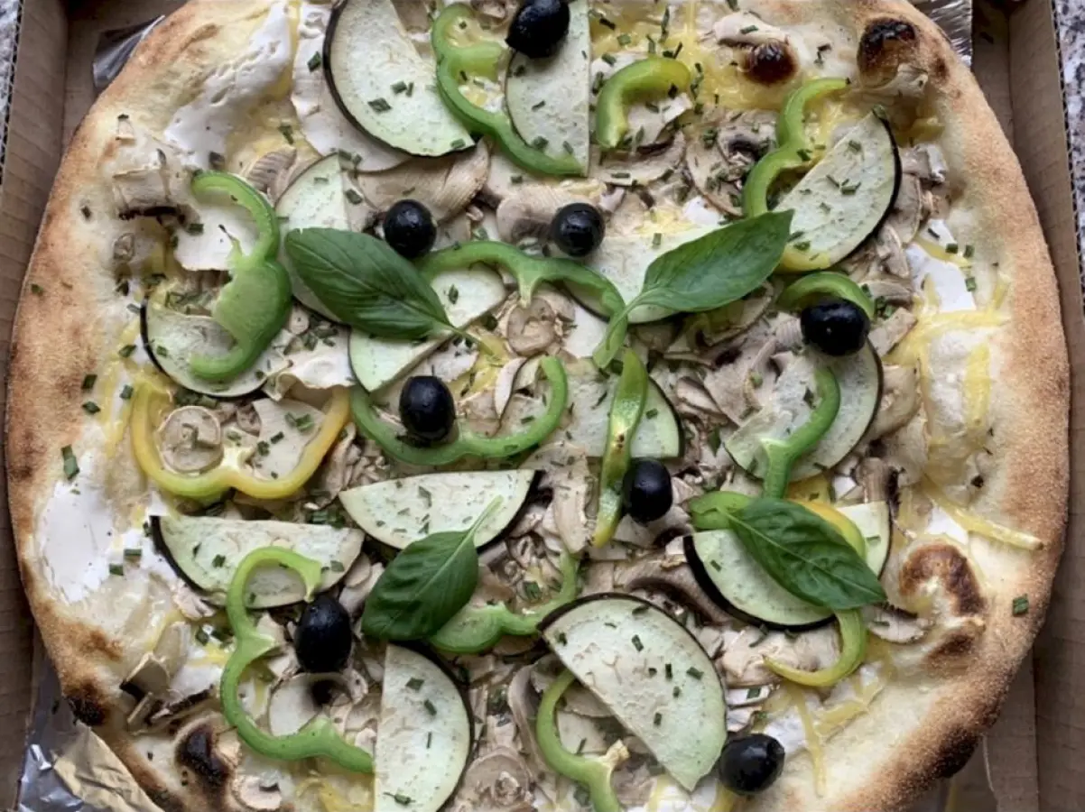 Soja jogurt, Violife veganski sir, gljive, patlidžan, paprika, vlasac, crne masline.