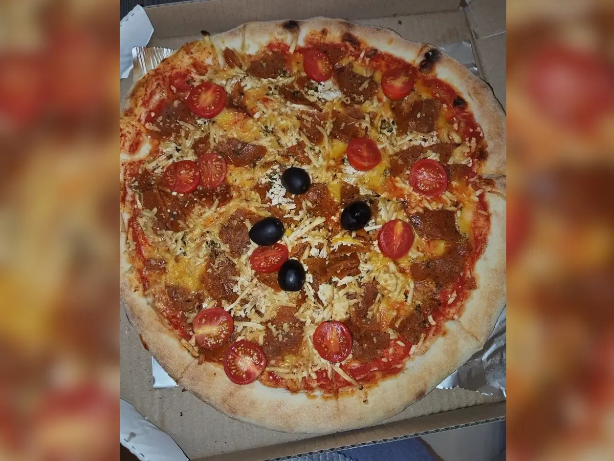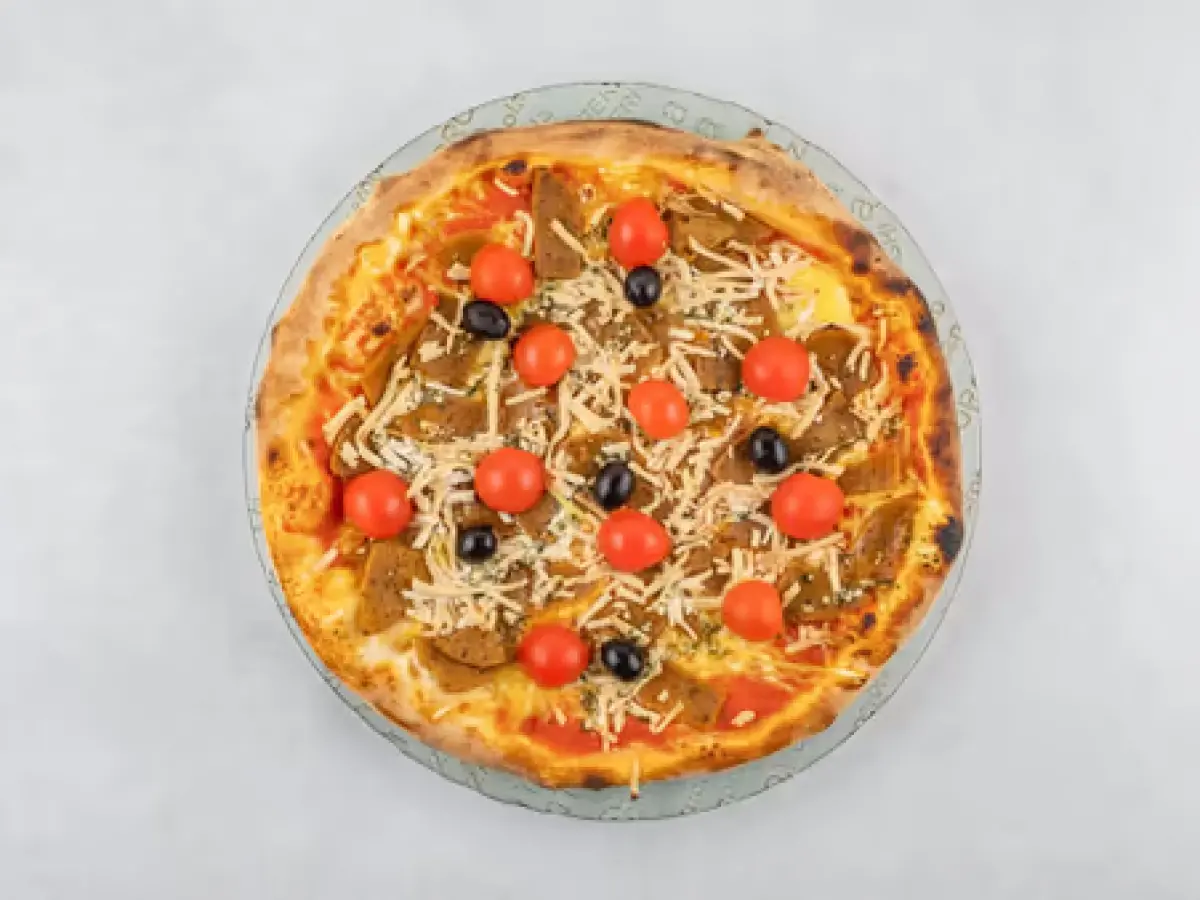 Pulpa, Violife veganski sir, Primavita veganska mozzarella, dimljeni tofu, seitan kebab, dressing (češnjak i peršin u maslinovom ulju), cherry rajčice, masline, origano.