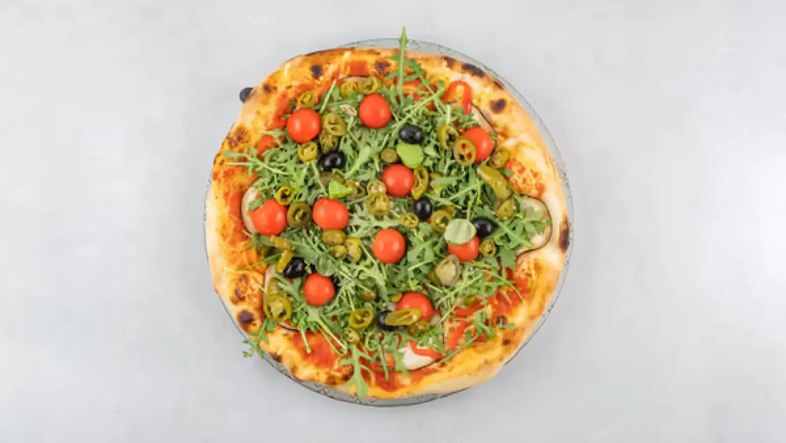 Pulpa, Violife veganski sir, patlidžan, paprika, cherry rajčice, rikula, jalapeño papričice, crne masline, origano-