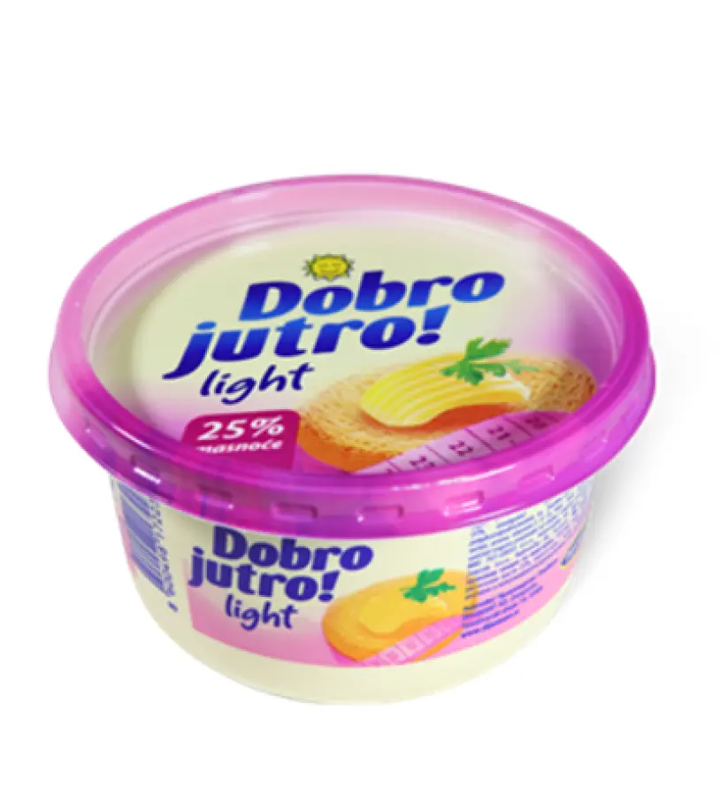 voda, biljna ulja i masti 25 %, emulgatori – mono i diglicerdi masnih kiselina i poliglicerolpoliricinoleat, kuhinjska sol 0,5 %, kiseline (E270, E330), konzervans – kalij sorbat, aroma, vitamini E, A i D3, boja – beta karoten