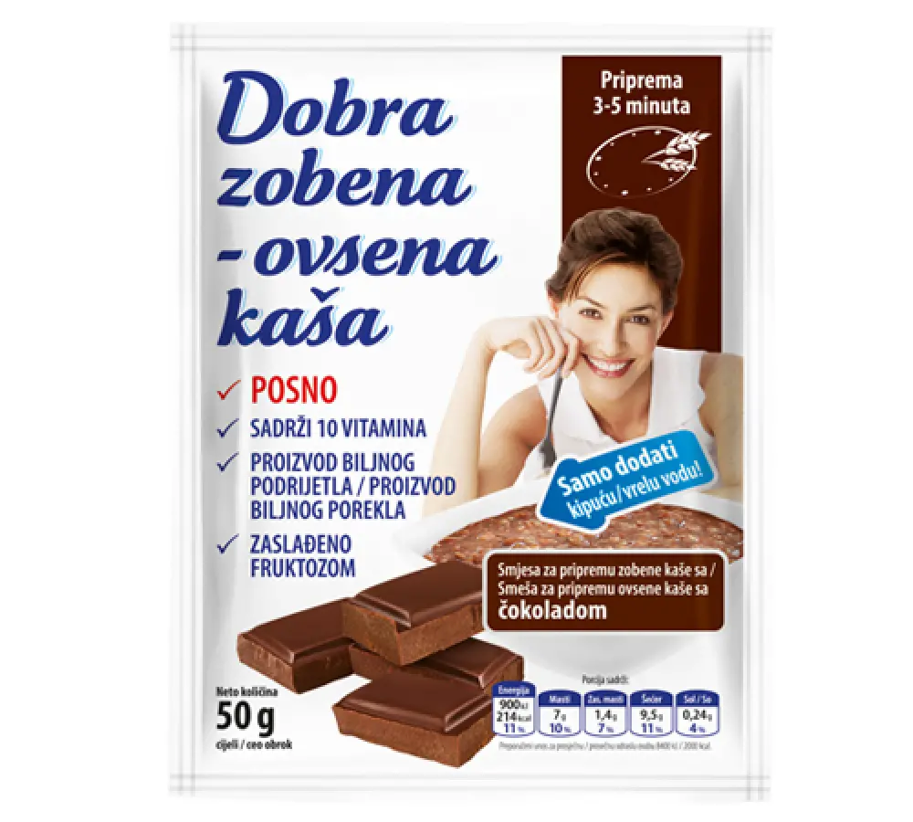 Zobene pahuljice 45 %, osušeni glukozni sirup, fruktoza 14,4 %, djelomično hidratirano ulje soje, kukuruzni škrob, komadići čokolade 3 % (kakao masa, šećer, dekstroza, emulgator sojin lecitin), kakao prah sa smanjenim udjelom masti, aroma, sol, kompleks vitamina (C, E, B1, B2, B5, B6, B9, B12, nijacin, biotin).