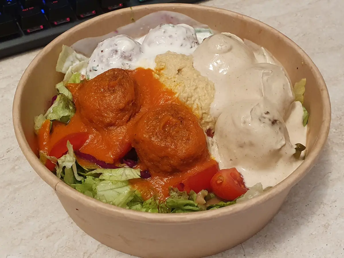 Hummus, mix salata, ukiseljeni crveni kupus, rajčica, kiseli krastavci, dressing, falafel 6 komada po dva od svakog okusa, umaci tahini, soya jogurt vlasac, hot salsa.