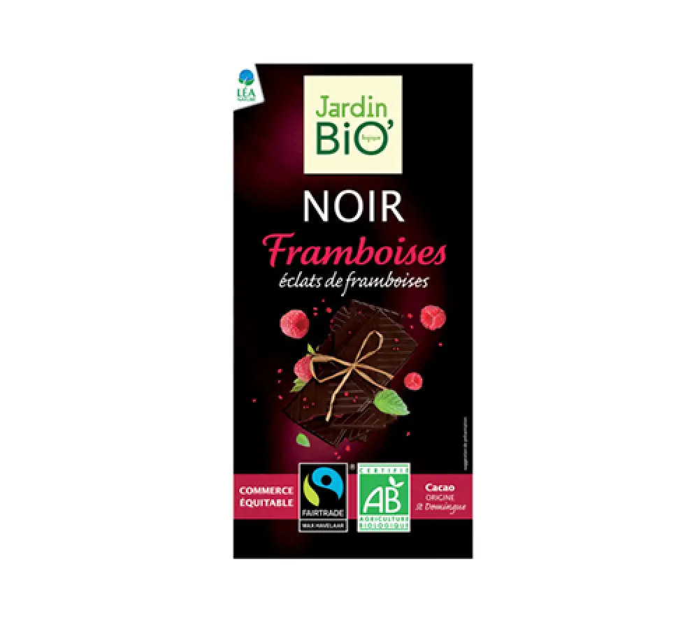 kakao masa (iz Dominikanske Republike), šećer od šećerne trske, kakaov maslac, komadići malina 2 %, emulgator: suncokretov lecitin, ekstrakt vanilije