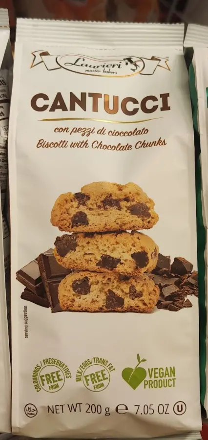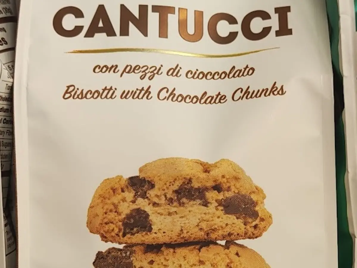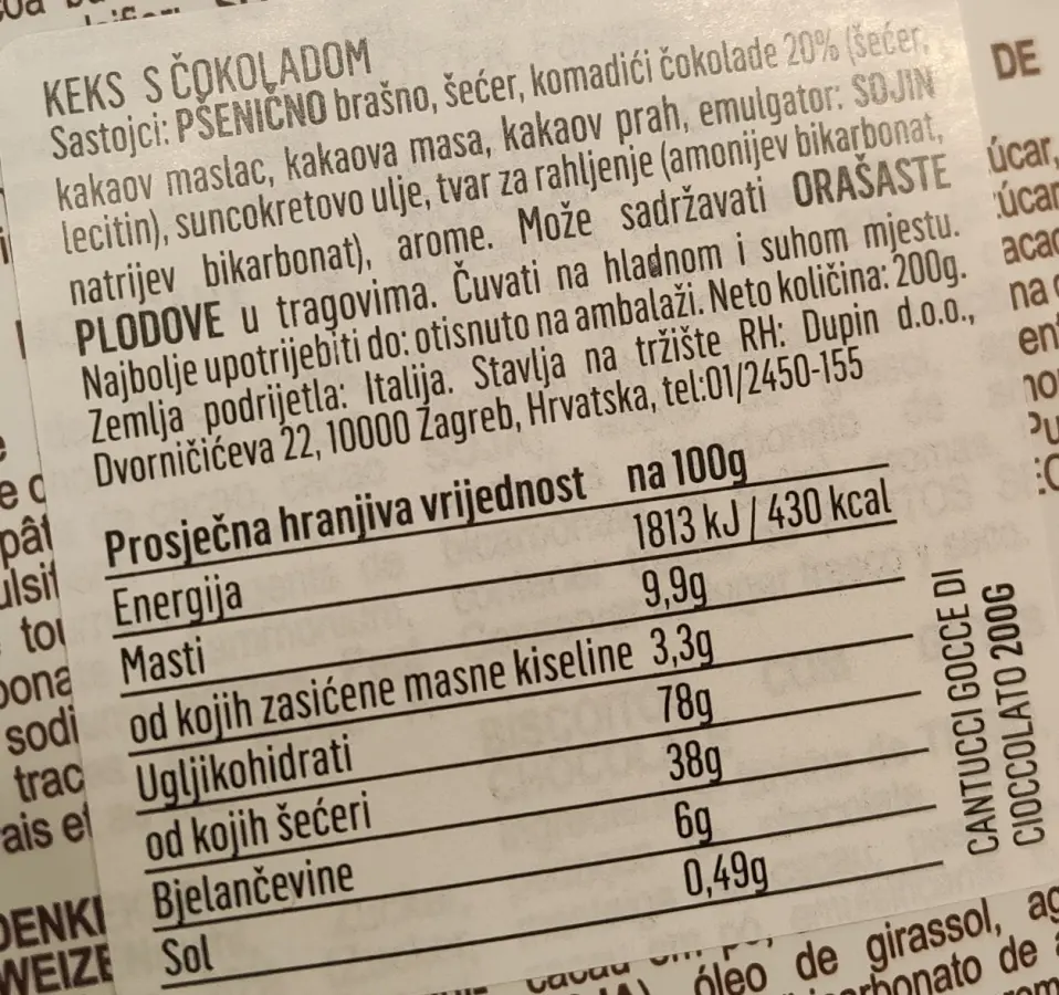 Sastojci: pšenično brašno, šećer, komadići čokolade 20 % (šećer, kakaov maslac, kakaova masa, kakaov prah, emulgator: sojin lecitin), suncokretovo ulje, tvar za rahljenje (amonijev bikarbonat, natrijev bikarbonat), arome.