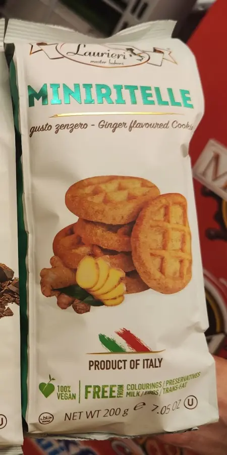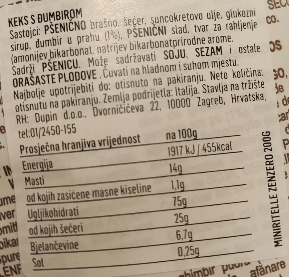 Sastojci: pšenično brašno, šećer, suncokretovo ulje, glukozni sirup, đumbir u prahu (1 %), pšenični slad, tvar za rahljenje (amonijev bikarbonat, natrijev bikarbonat), prirodne arome.