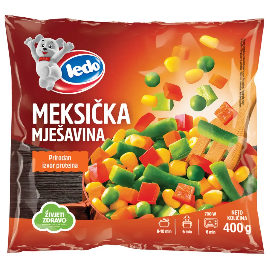Povrće u promjenjivim udjelima: kukuruz šećerac, grašak, mrkva, zelena mahuna, crvena paprika, zelena paprika.