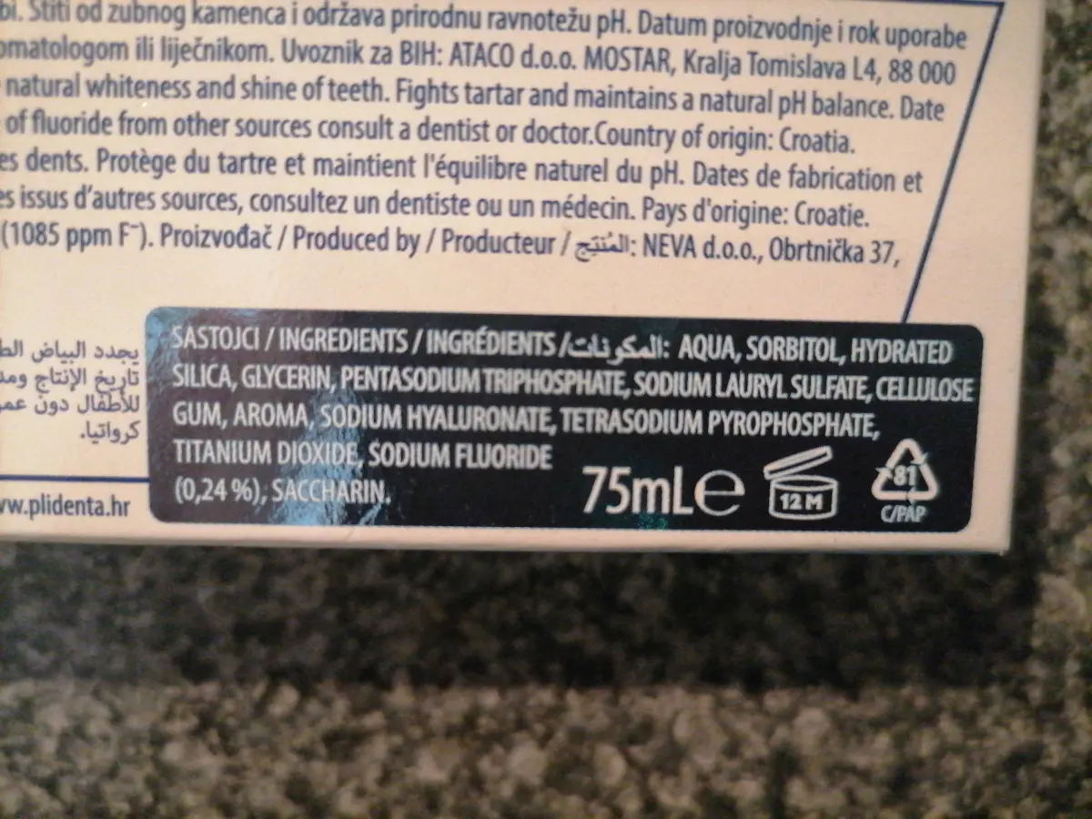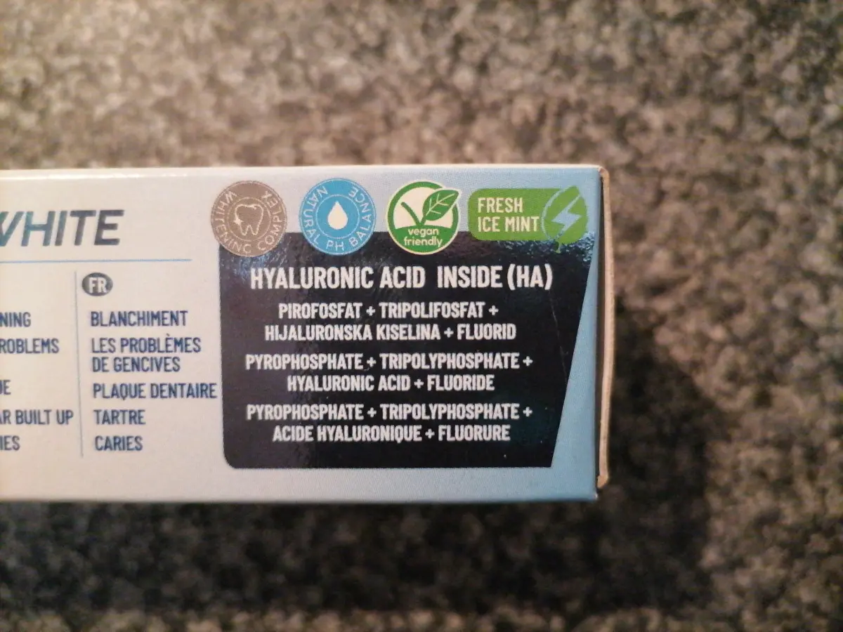 Sadrži hijeluronsku kiselinu koja smanjuje osjetljivost zuba na toplo i hladno, te vraća prirodnu bjelinu zuba.