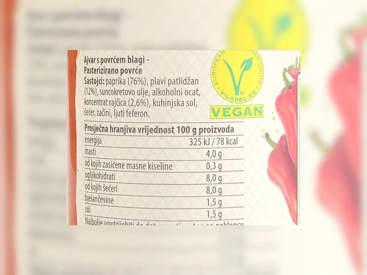 Paprika 73 %, plavi patlidžan 12 %, ocat, biljno ulje, koncentrat rajčice 3 %, kuhinjska sol, šećer, ljuti feferoni, začini.