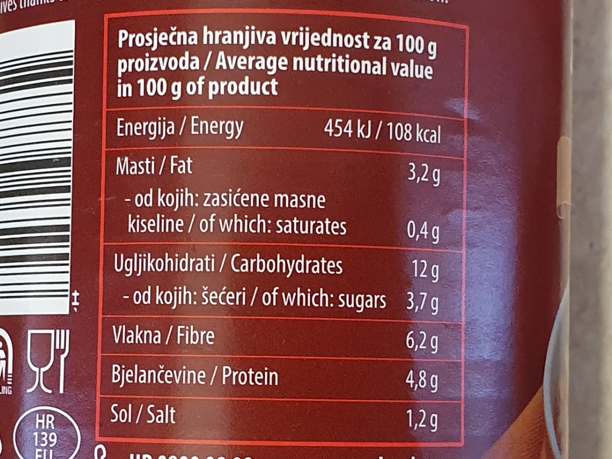 Prosječna hranjiva vrijednost na 100 g