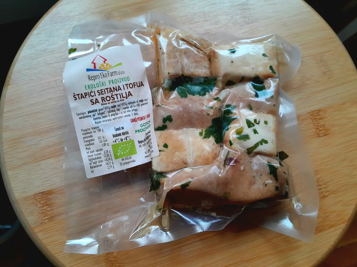 pšenični gluten 45 %, tofu 45 %, marinada od soja sosa, đumbira, češnjaka i začinskog bilja