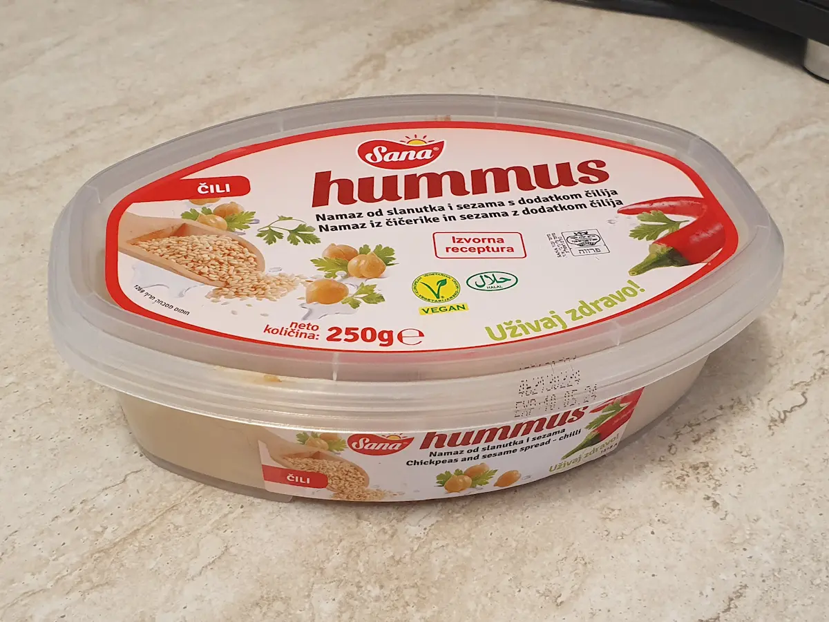 Slanutak, tahini (pasta od sezama), maslinovo ulje, čili, začini, sol, limunska kiselina, stabilizator, konzervans E202.
