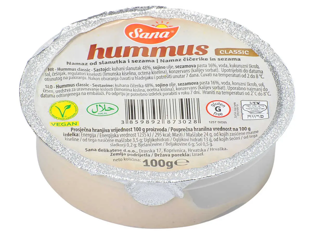 Kuhani slanutak 48 %, sojino ulje, sezamova pasta 16 %, voda, kukuruzni škrob, sol, češnjak, regulatori kiselosti (limunska kiselina, octena kiselina), konzervans (kalijev sorbat).