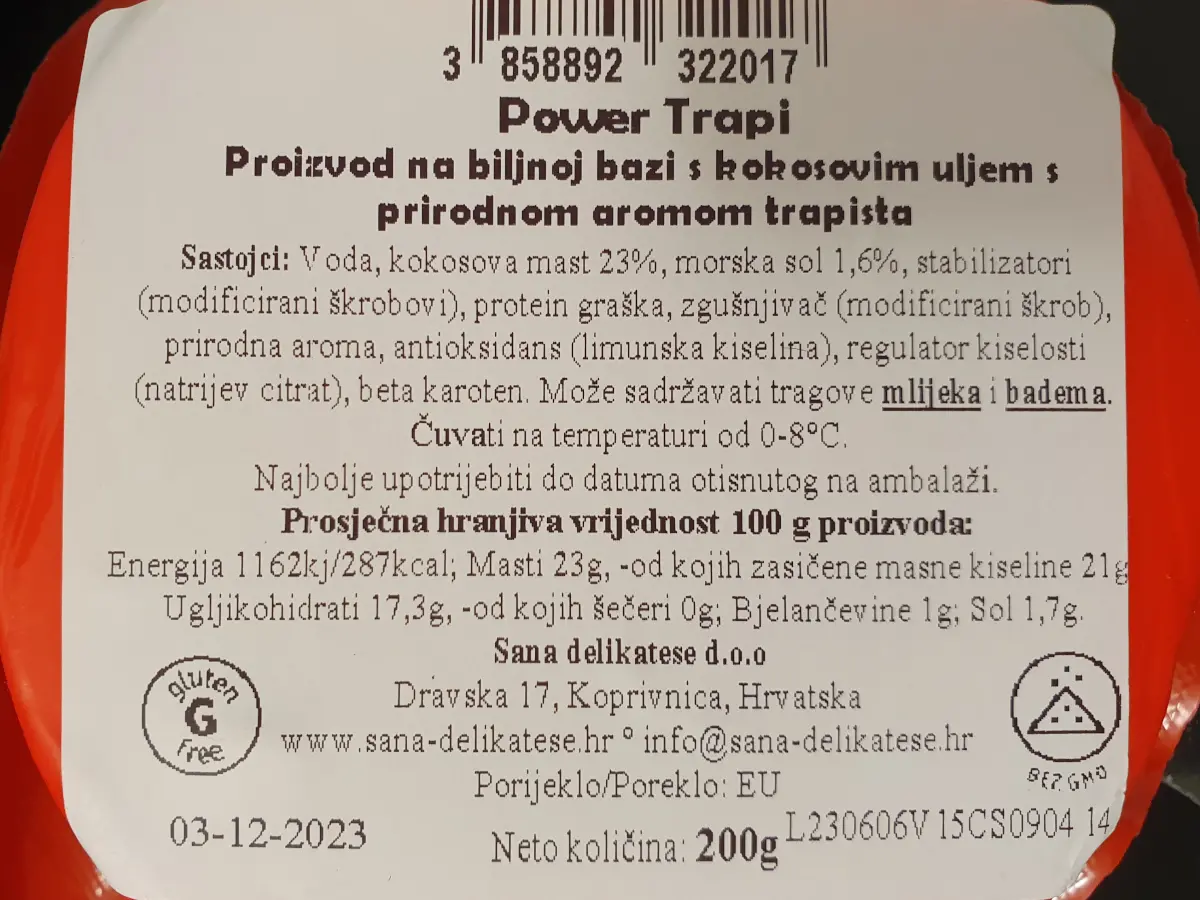 Voda, kokosova mast 23 %, morska sol 1,6 %, stabilizatori (modificirani škrobovi), protein graška, zgušnjivač (modificirani škrob), prirodna aroma, antioksidans (limunska kiselina), regulator kiselost (natrijev citrat), beta karoten.