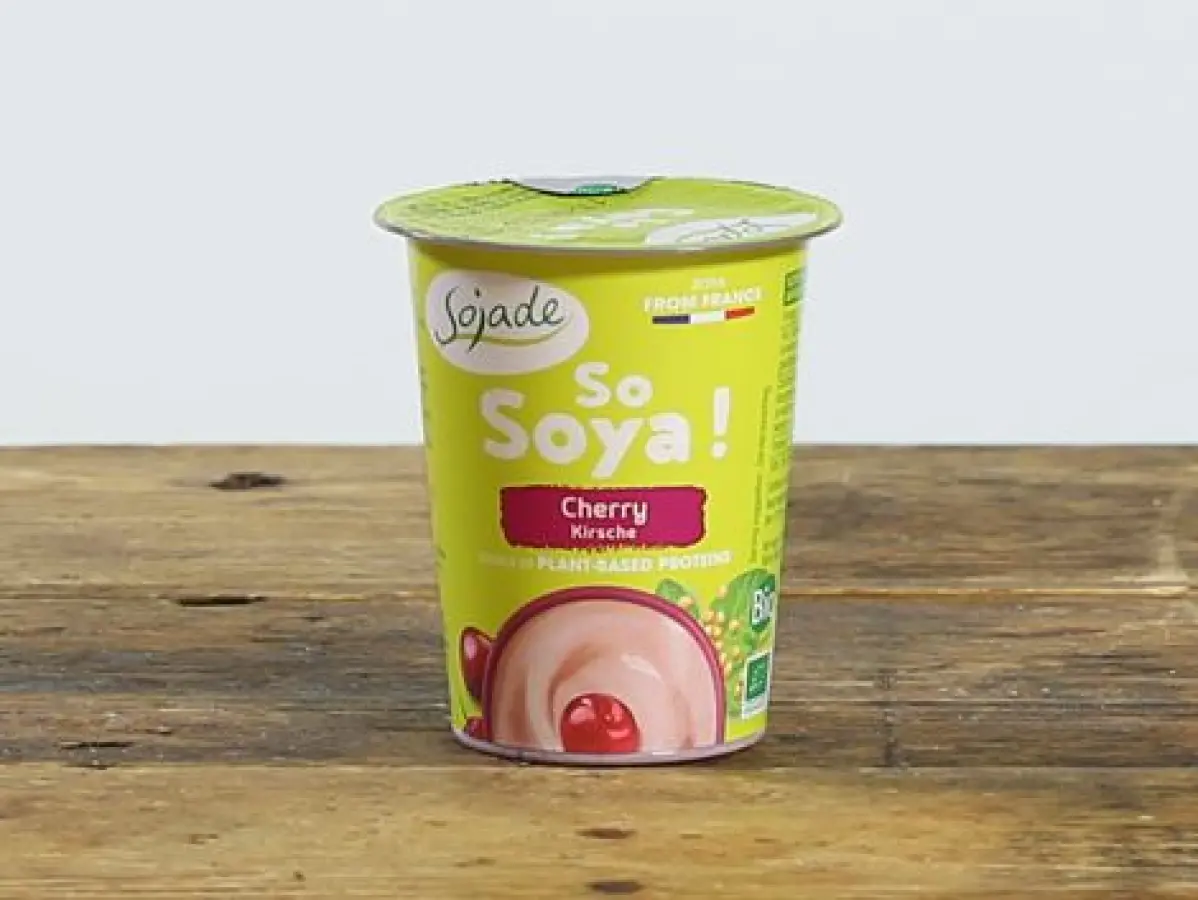Soya drink* 78 % (Water, Hulled soya beans* 9.2 %), Cherry* 10 %, Raw Cane Sugar*, Tapioca Starch*, Natural Flavouring*, Thickeners: Pectin - Locust Bean Gum, Elderberry Juice Concentrate*, Acidity Regulator: Calcium Citrate, selected live cultures of which Bifidus and Acidophilus.