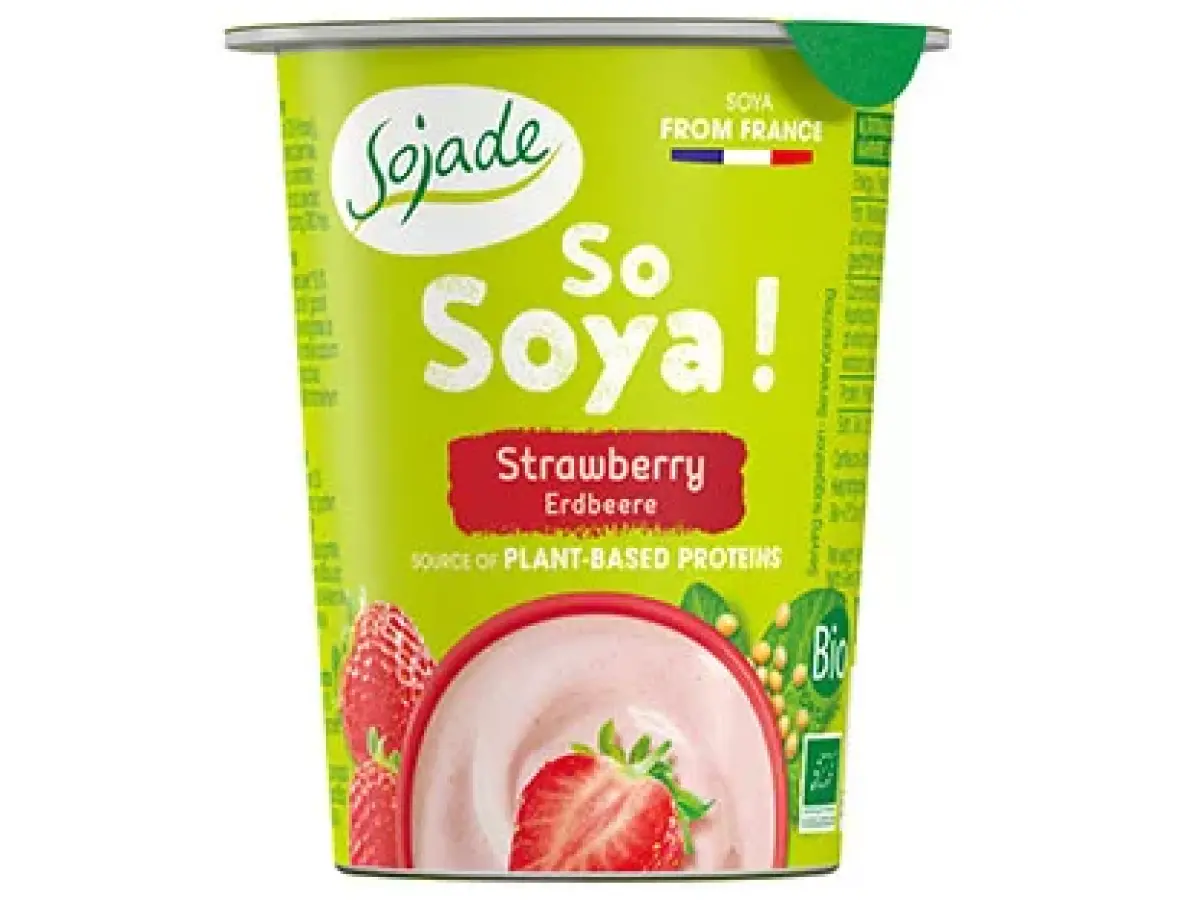 Napitak od soje* (izvorska voda, cjelovito zrno soje* 8 %), pulpa od jagode* 9 %, smeđi šećer od šećerne trske*, sirup od žitarica*, prirodna aroma jagode*, sok od bazge*, zgušnjivač: pektin, karuba guma, kalcijev citrat, regulator kiselosti: limunska kiselina. Izvorne kulture Bifidus i Acidophilus.