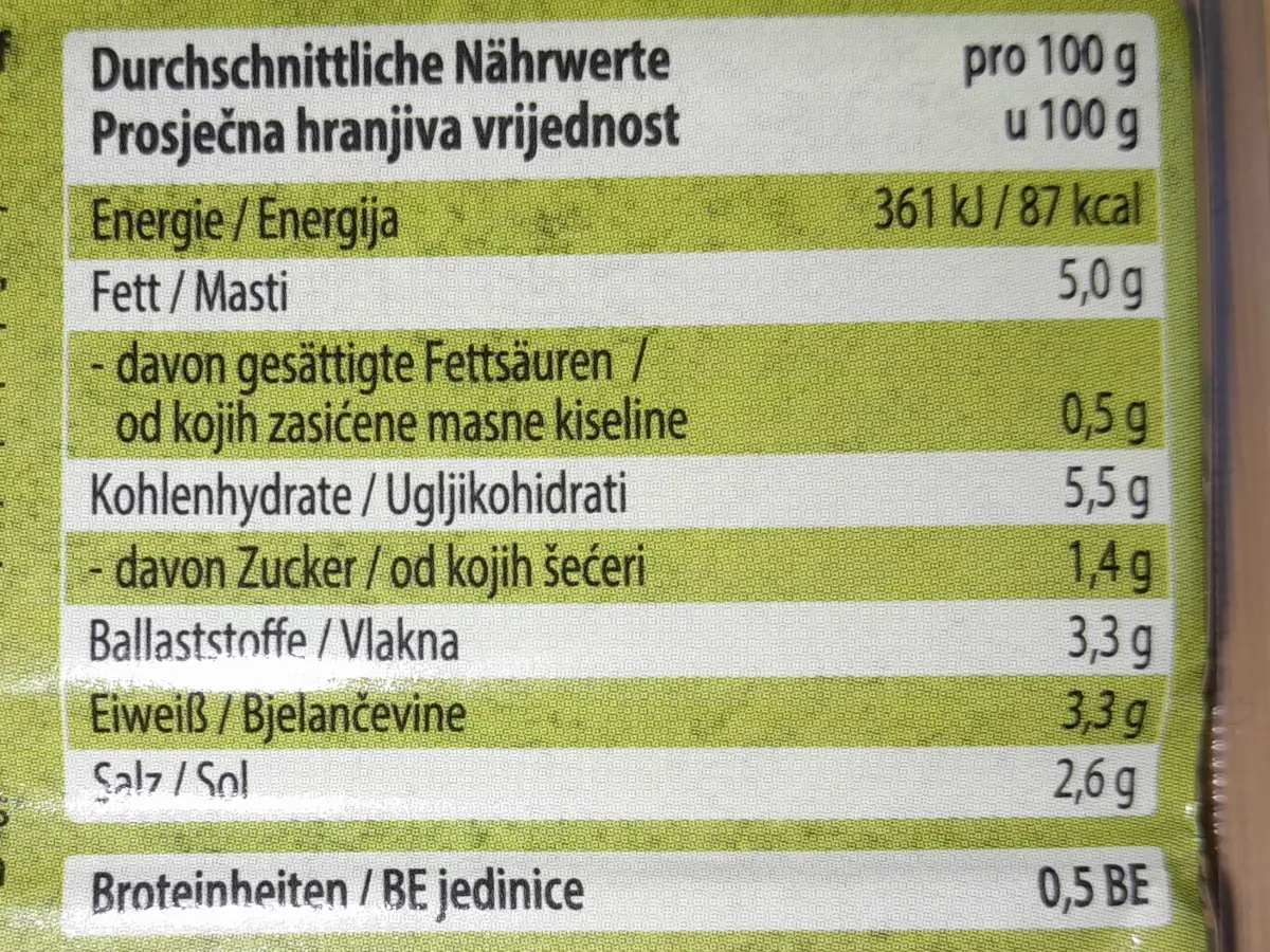 Voda, škrob, repičino ulje, bjelančevine graška 3,9 %, vlakna citrusa, nejodirana sol, aroma, začini, koncentrat hrena, ekstrakt paprike, psylium ljuskice, zgušnjivači: ksantan guma, konjak, karagenan, učvrščivač: kalijev klorid, antioksidans: askorbinska kiselina, šećer, dekstroza, aroma dima, konzervans: kalijev sorbat.
