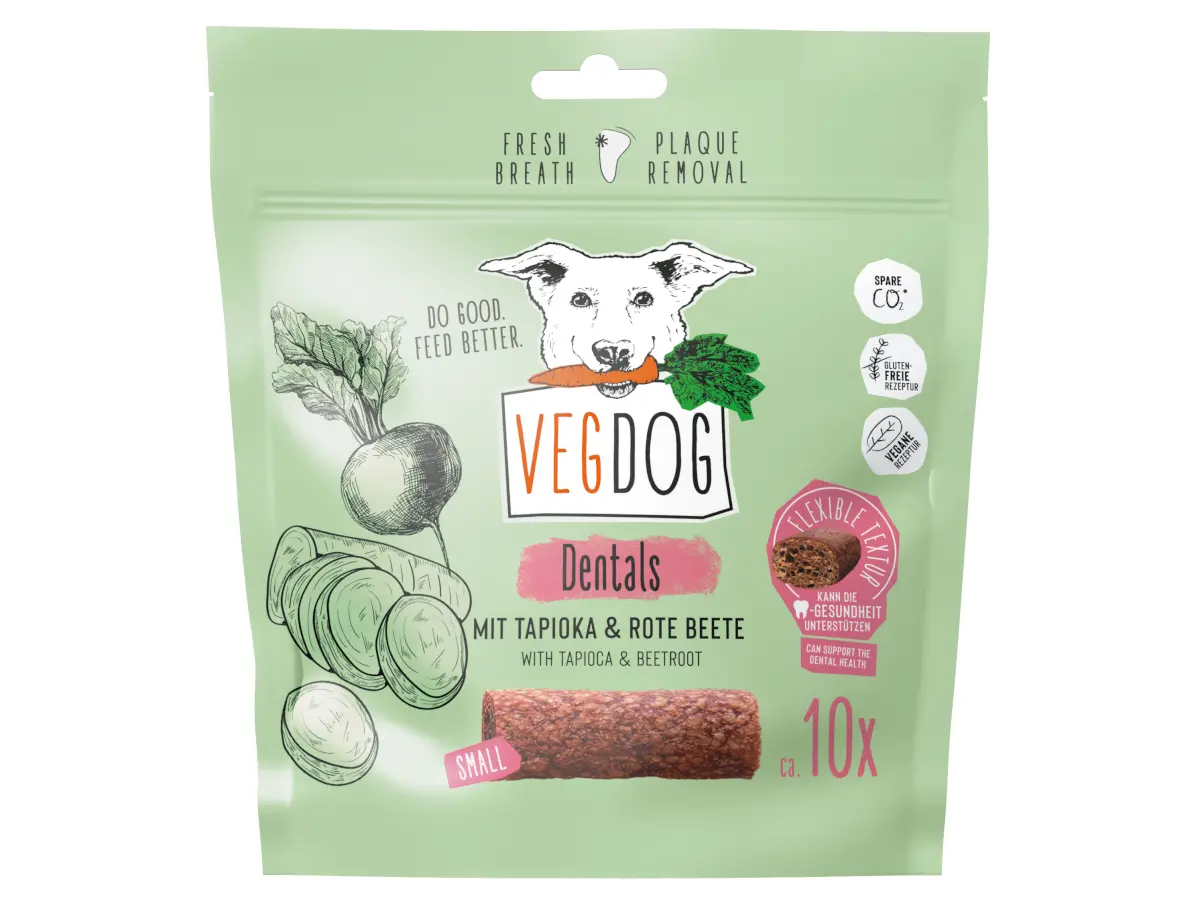 But this is not enough: with VEGDOG DENTALS, your dog will not only have fun, but will also be in excellent condition. A true animal and environmental rescuer! The three advantages of chewing bands are: the sponge structure, the cleaning of the teeth is particularly well supported and allows the gums to be massaged while chewing. Beetroot gives plenty of vitamin C and contains fiber. It regulates intestinal activity and promotes cell metabolism and renewal. Tapioca flour as an alternative source of carbohydrates, however, strengthens the muscles and joints. Thanks to the hypoallergenic formula, DENTALS are also suitable for dogs with allergies.