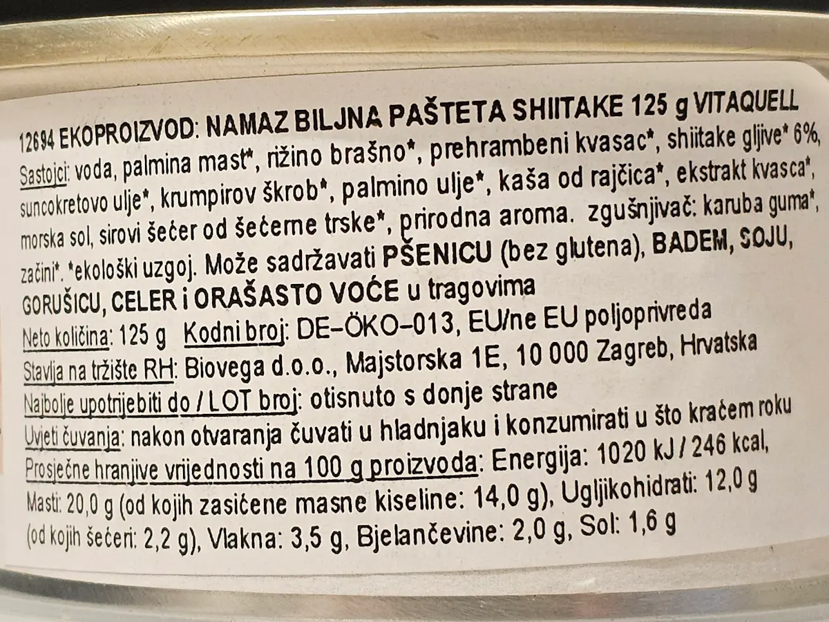 voda, palmina mast, rižino brašno, shiitake gljive 6 %, suncokretovo ulje, krumpirov škrob, palmino ulje, pasirana rajčica, ekstrakt kvasca, morska sol, sirovi šećer od šećerne trske, priordno brašno bez glutena, zgušnjivač: karuba guma; začini