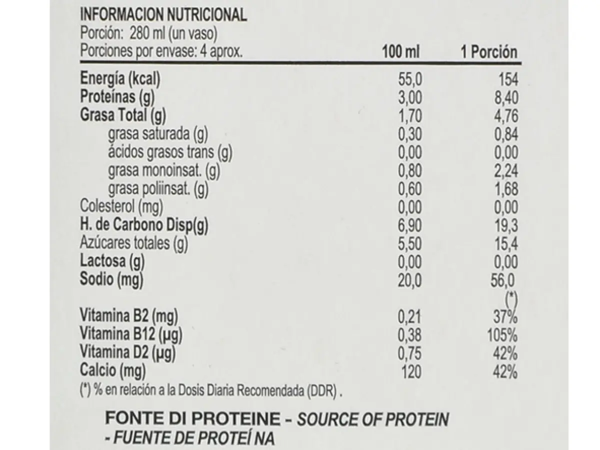 Voda, talijanska soja 5,8%, šećer, kalcijev karbonat, regulator kiselosti: kalijevi fosfati, morska sol, arome, vitamini (vitamin B2, B12, D2).