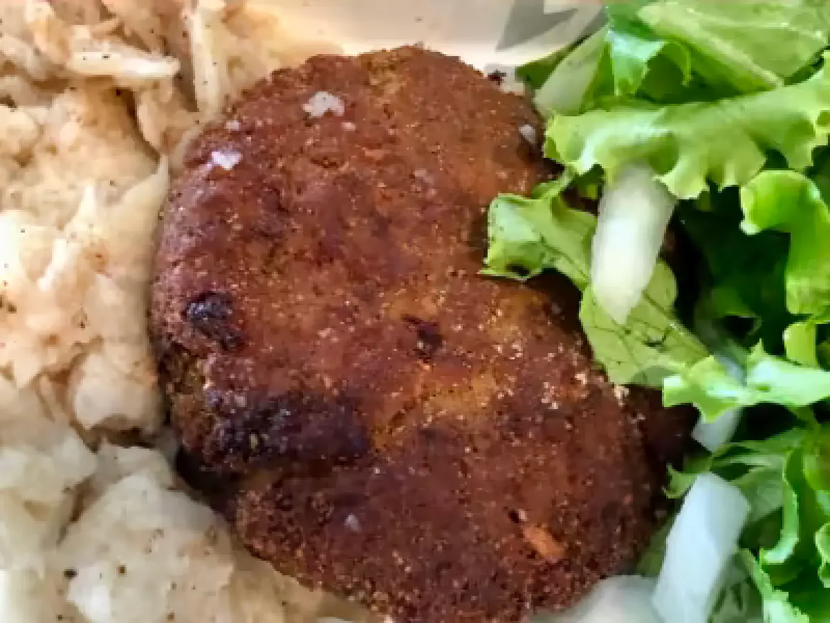 Punjena pljeskavica s vegan cheddar sirom, mlinci, zelena salata, luk, soja, integralno brašno, chia sjemenke, luk.