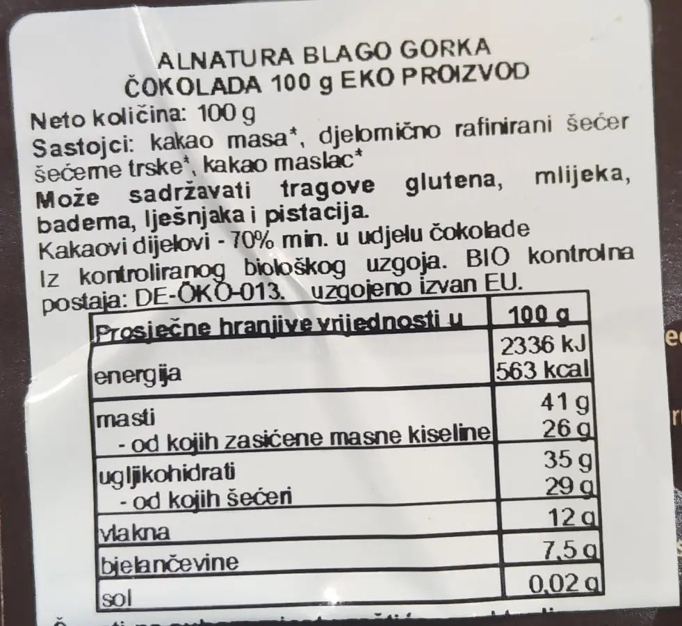Sastojci: kakao masa, djelomično rafinirani šećer šećerne trske, kakao maslac.