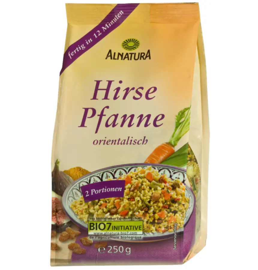 Proso 75 %, smokve 3,2 %, mrkva 3,2 %, grožđice 2,4 %, poriluk 2,4 %, bundeva, prženi luk, kari, paprika, marelice, špinat, luk, kokosove mrvice, pastrnjak, ulje suncokreta, rižino brašno, morska kuhinjska sol.