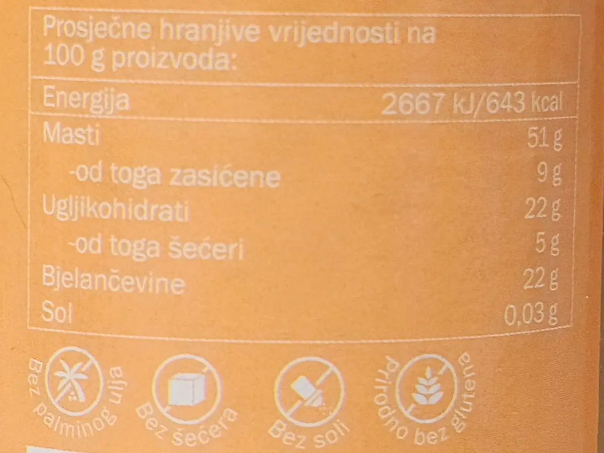 - energija: 2667 kJ / 643 kcal