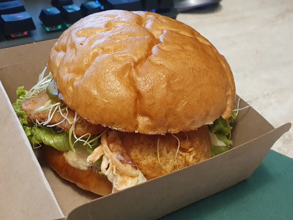 Domaće pecivo, pohana bukovača, karamelizirani luk, salata, klice češnjaka, kiseli krastavci, burger umak