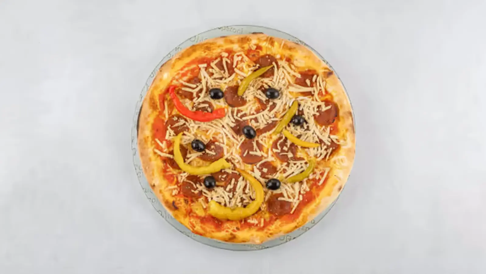 Pulpa, Violife veganski sir, Primavita veganska mozzarella, Stellina kobasica, dimljeni tofu, blagi ili ljuti feferoni, masline, origano.