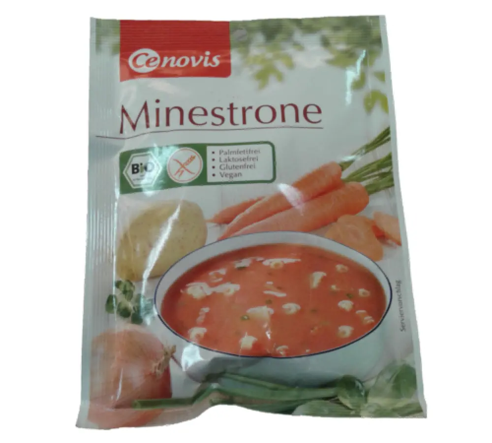 tjestenina (od rižinog brašna), maltodekstrin, morska sol, kukuruzni škrob, rižino brašno, rajčica, krumpir, mrkva, poriluk, luk, pastrnjak, esktrakt kvasca, nerafinirani šećer šećerne trske, suncokretovo ulje, češnjak, bosilja, kurkuma, peršin, mažuran