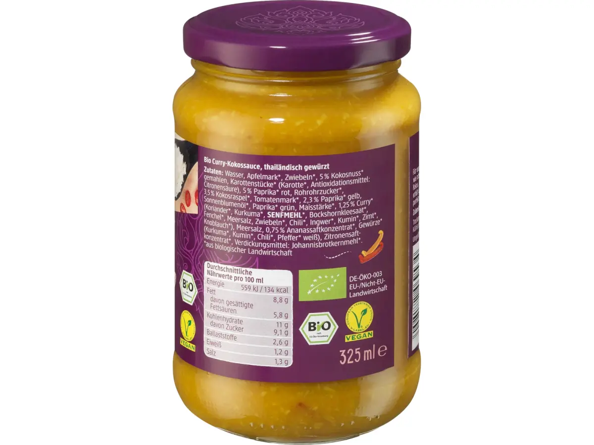 Voda, pire od jabuke*, luk*, 5 % mljevenog kokosa*, 5 % komadići mrkve* (mrkva*, antioksidansi: limunska kiselina), 5 % crvene paprike*, neprerađeni šećer šećerne trske*, 3,5 % komadića kokosa*, pire od rajčice*, 2,3 % žute paprike*, suncokretovo ulje*, zelena paprika*, kukuruzni škrob*, 1,25 % curry* (korijander*, kurkuma*, korijen gorušcice u prahu*, piskavica*, komorač*, morska kuhinjska sol, luk*, čili*, đumbir*, kumin*, cimet*, češnjak*), morska kuhinjska sol*, 0,75 % koncentrata soka od ananasa*, začini* (kurkuma*, kumin*, čili*, bijeli papar*), koncentrat soka od limuna*, tvar za zgušnjavanje: brašno rogača*.