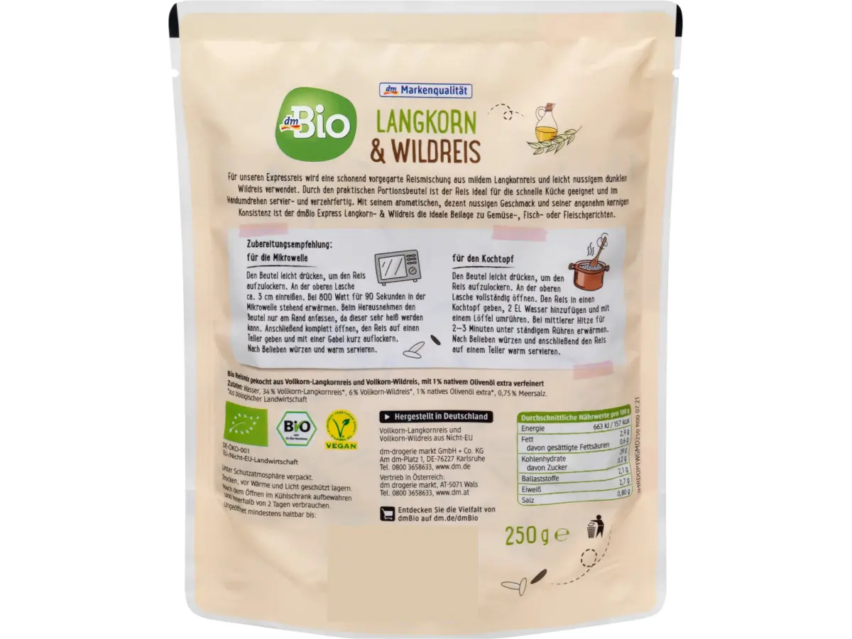 Voda, 34 % integralna riža dugog zrna*, 6 % integralna divlja riža*, 1 % ekstra djevičansko maslinovo ulje*, 0,75 % morska kuhinjska sol.