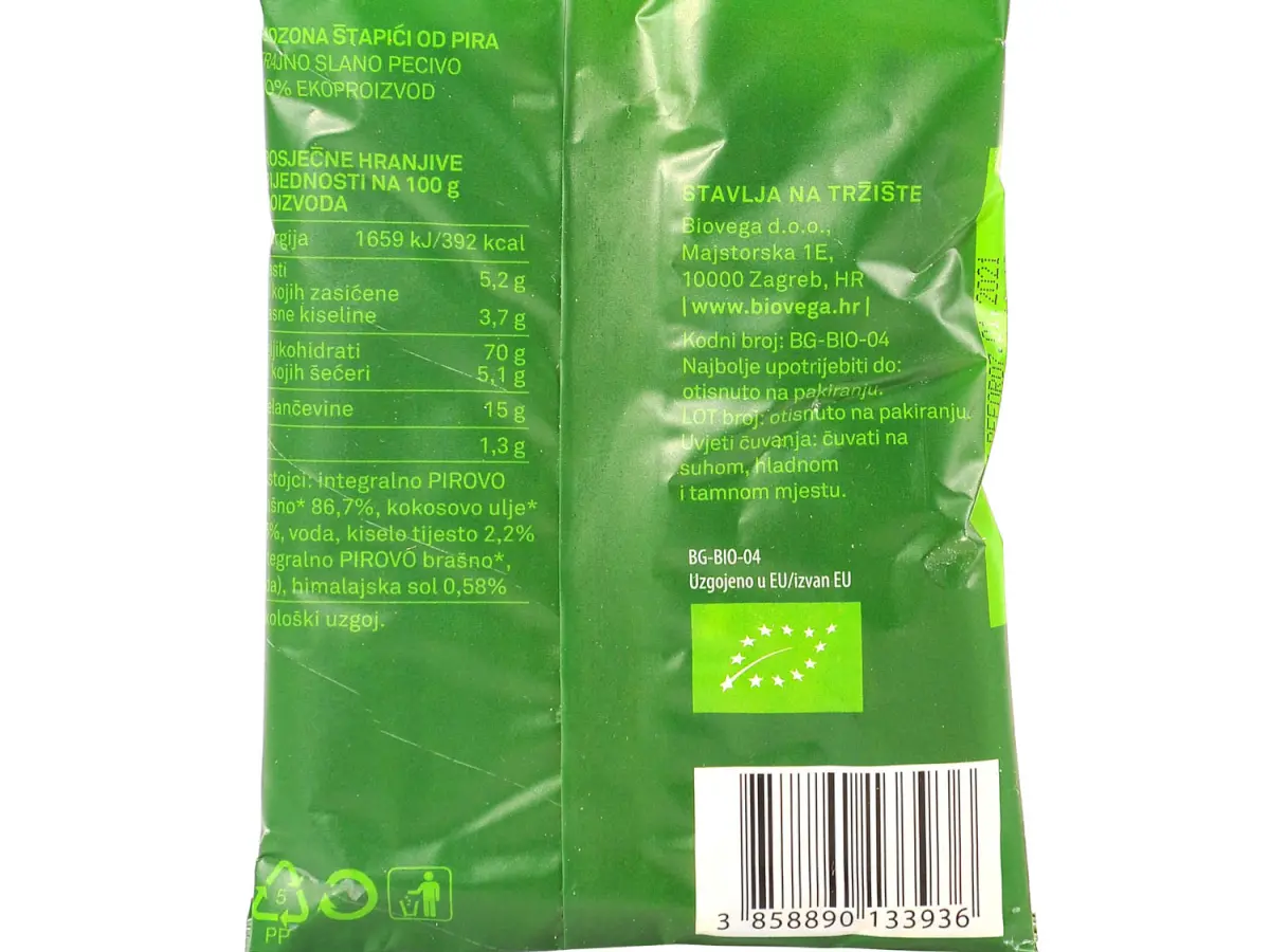 Integralno pirovo brašno* 86,7 %, kokosovo ulje * 6,5 %, voda, kiselo tijesto 2,2 % (integralno pirovo brašno *, voda), himalajska sol 0.58 %.