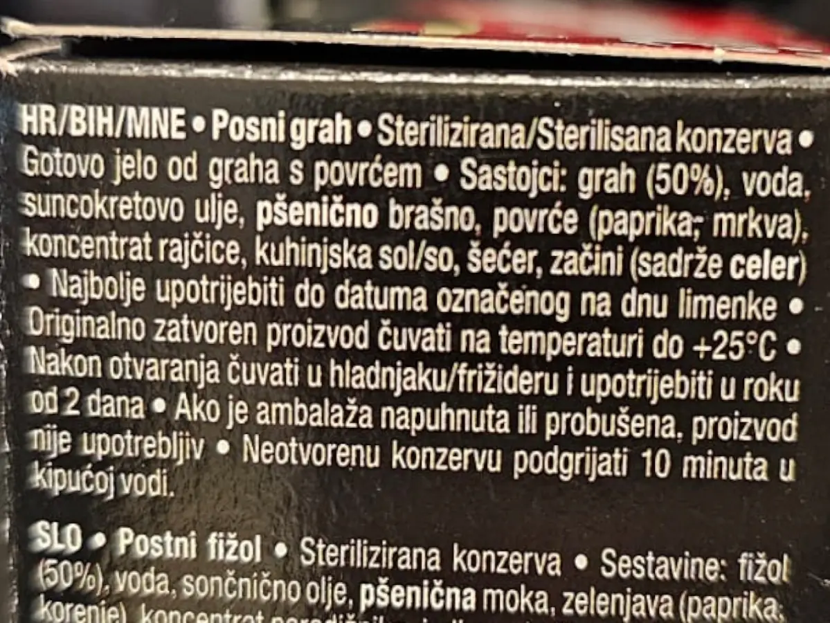 Grah 50 %, voda, suncokretovo ulje, pšenično brašno, povrće (paprika, mrkva), koncentrat rajčice, kuhinjska sol, šećer, začini (sadrže celer).