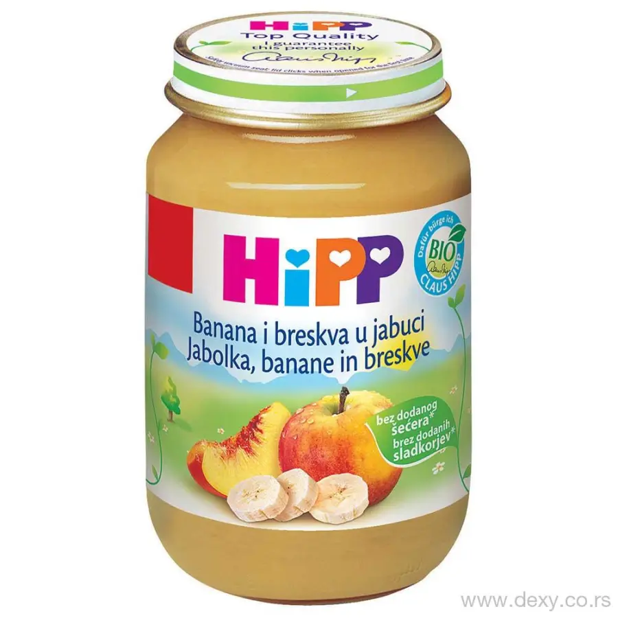 Voće 97 % (jabuke 50 %, kaša od banane 16 %, kaša od breskve 16 %, blago kiseli sok od jabuke od koncentriranog soka jabuke), rižin gris, vitamin C
