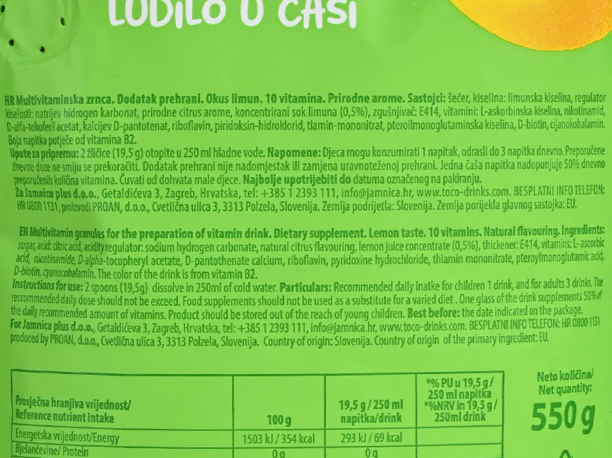 Šećer, kiselina: limunska kiselina, regulator kiselosti: natrijev hidrogen karbonat, prirodne citrus arome, koncentrirani sok limuna 0,5 %, zgušnjivač: E414, vitamini: L-askorbinska kiselina, nikotinamid, D-alfa-tokoferil acetat, kalcijev D-pantotenat, roboflavin, piridoksin-hidroklorid, tiamin-mononitrat, pteroilmonoglutaminska kiselina, D-biotin, cijanokobalamin.