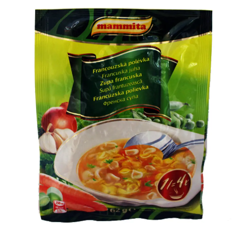 tjestenina 53 % (krupica pšeničnog brašna), jodirana sol, pojačivač okusa: mononatrijev glutaminat, mješavina povrća (mrkva, luk, prženi luk, korijen celera, češnjak, poriluk), krumpirov škrob, biljna mast, aroma, ekstrakt kvasca, šećer, mješavina začina, list peršina