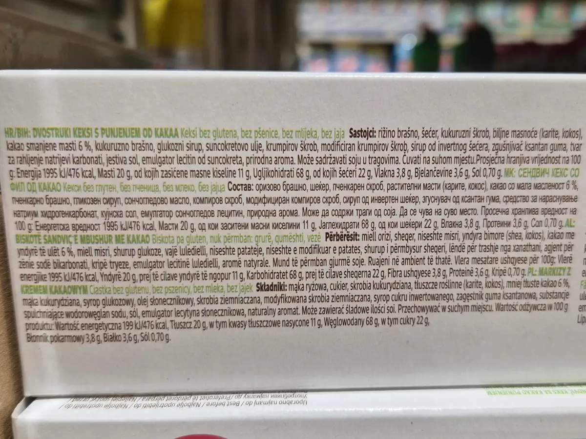 These biscuits do not contain any wheat, milk, eggs, lactose or palm oil.