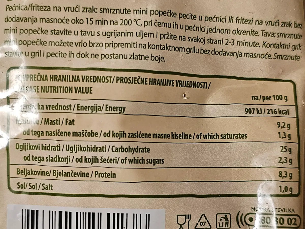 Brzo smrznuti panirani mini popečci na bazi povrća, djelomično termički obrađeni.