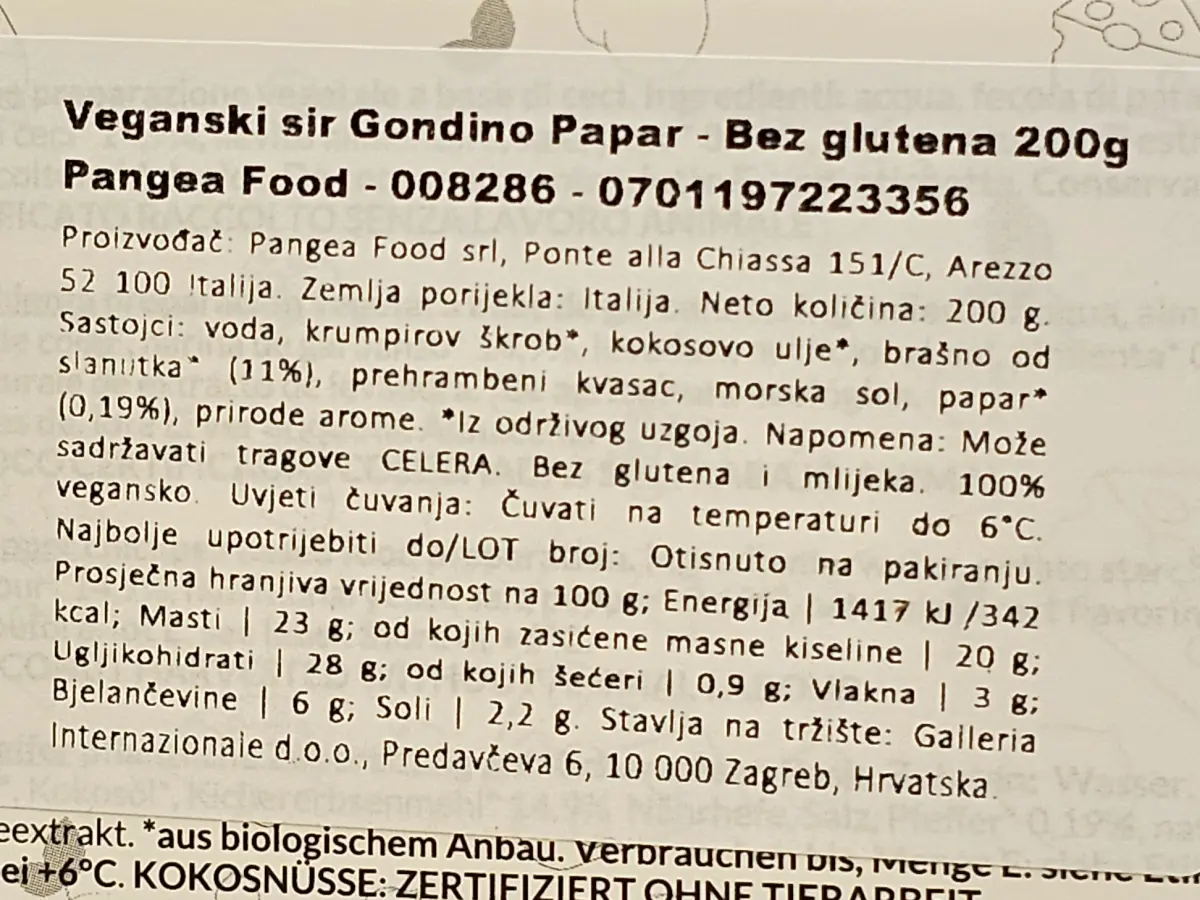 Ingredients: Water, potato starch, coconut oil, chickpea flour 10.8 %, nutritional yeast, sea salt, pepper 0.19 %, natural flavourings.
