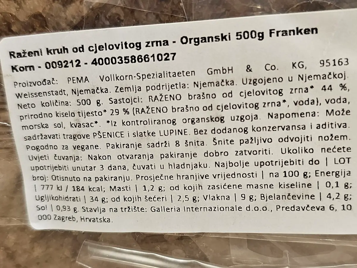 Raženi kruh od cjelovitog zrna 500 g